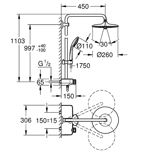 Верхний душ; Ручной душ; Штанга; Кронштейн; Шланг; Набор креплений
